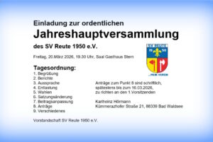 Der SV Reute 1950 e.V. lädt alle Mitglieder, Anhänger, Förderer, Freunde und sonstigen Interessierten zu seiner ordentlichen Jahreshauptversammlung am Freitag, 20. März 2026, ins Gasthaus Stern (Saal) ein. Auf der Tagesordnung stehen neben den Vorstandsberichten und üblichen Regularien auch Wahlen und eine Satzungsänderung, Beginn ist um 19.30 Uhr. Zum gemeinsamen Abschluss des Abends sind im … Continue reading Einladung Jahreshauptversammlung am 20.03.2026