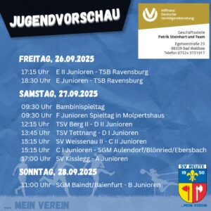 Los geht’s am Freitagabend mit den E-Junioren, beide Teams empfangen den TSB Ravensburg. Gespannt auf den Samstag warten die Jüngsten des SVR, der erste Spieltag der Herbstrunde steht an. Für die Bambini geht es nach Baindt, für die F-Junioren nach Molpertshaus. Die D2 konnte unter der Woche bereits das Heimspiel gegen die SGM Aulendorf/Blönried/Ebersbach deutlich mit 8:0 für sich entscheiden und muss nun zum TSV Berg II. In der Leistungsstaffel treten die D1-Junioren in Tettnang an und wollen das erste Saisonspiel erfolgreich gestalten. Nach dem Auftaktsieg in Wolfegg will die C1 im Heimspiel gegen Aulendorf/Blönried/Ebersbach nachlegen, die C2 muss zum Tabellenführer SV Weissenau II. Die A-Junioren bestreiten in der Leistungsstaffel ein Auswärtsspiel beim Regionenliga-Absteiger SG Kisslegg. Die B-Junioren konnten am Donnerstagabend einen Sieg im Bezirkspokal in Ankenreute verbuchen und wollen die Woche im Auswärtsspiel bei der SGM Baindt/Baienfurt vergolden.