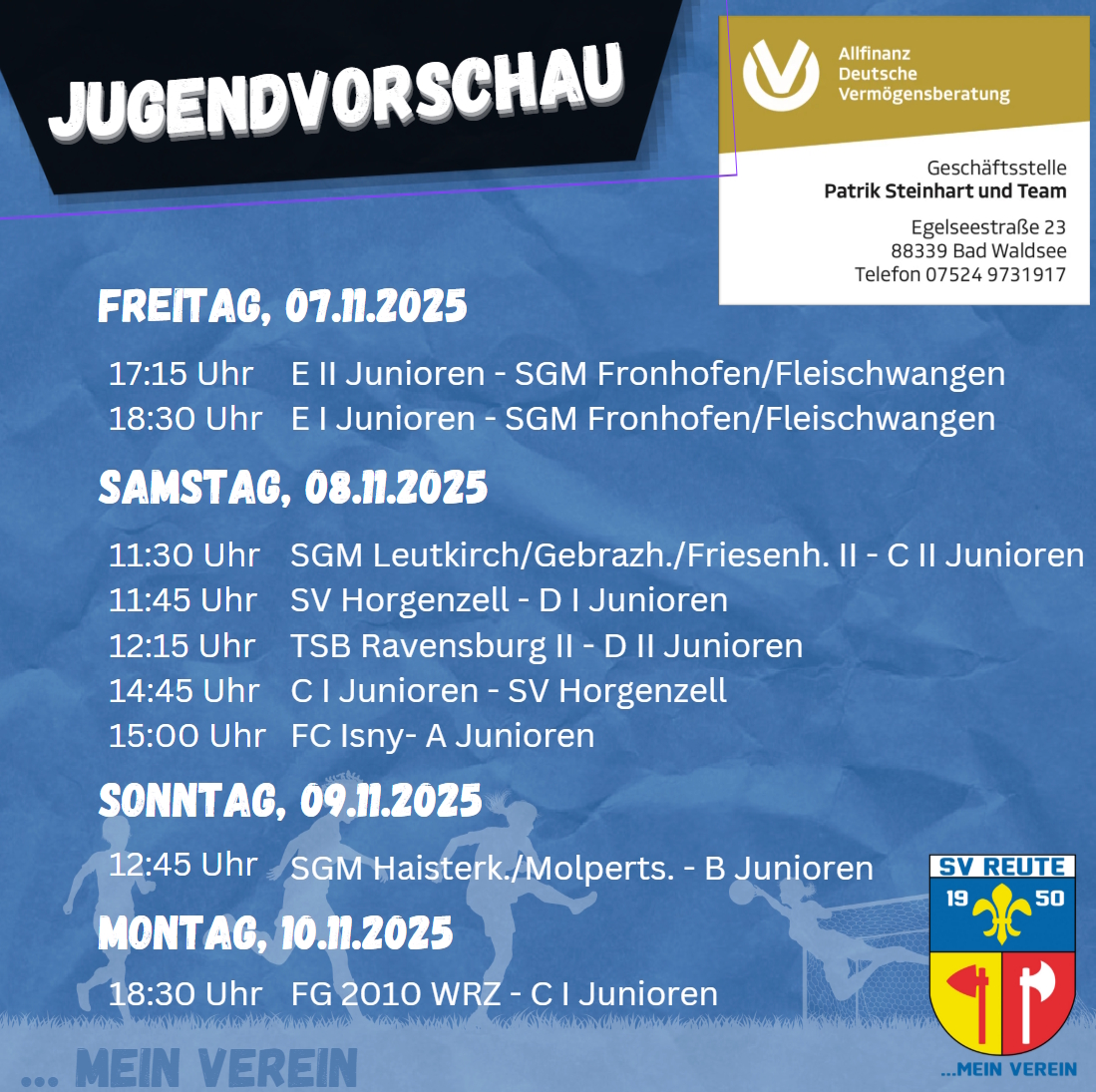 12:45 Uhr: B-Junioren SGM Haisterkirch/Molpertshaus I – SV Reute (in Haisterkirch)
