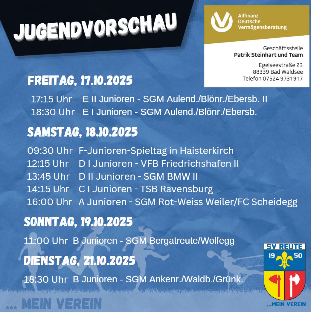 Im Heimspiel treffen die beiden Reutener E-Juniorenteams am Freitagabend auf die SGM Aulendorf/Blönried/Ebersbach, die Gastgeber wollen den Nachbarn möglichst gut Paroli bieten. Am Samstag steht für die F-Junioren der vierte und zugleich auch schon wieder letzte Spieltag der Herbstrunde an, gespielt wird in Haisterkirch. Der Spieltag der Bambini muss leider entfallen. In der Leistungsstaffel treffen die D1-Junioren auf Tabellenführer VFB Friedrichshafen II, die D2-Junioren haben im Derby die SGM Mochenwangen/Wolpertswende/Blitzenreute II zu Gast. Die C1-Junioren möchten gegen den TSB Ravensburg an der Spitzengruppe dranbleiben, die C2 ist spielfrei. Gegen den Tabellenzweiten SGM Rot-Weiß Weiler/Scheidegg geht’s für die Reutener A-Junioren in der Leistungsstaffel um weitere wichtige Punkte.