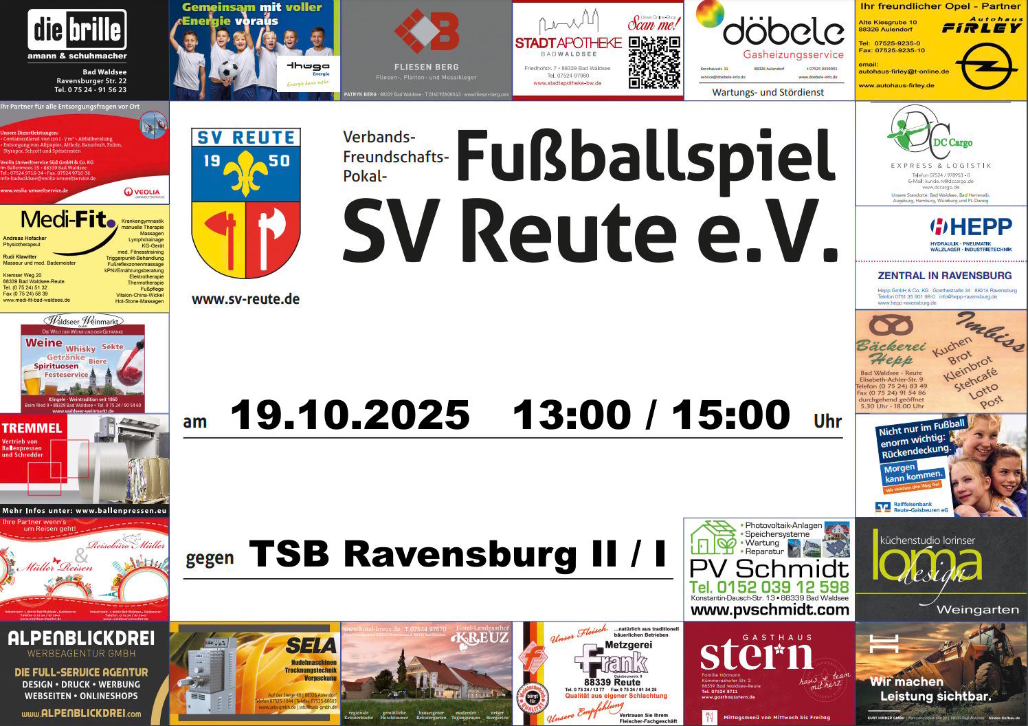 Der SV Reute erwartet am Sonntag im bereits siebten aber auch letzten Heimspiel des Kalenderjahres den TSB Ravensburg. Beide Frauenteams müssen auswärts in Aitrach bzw. Amtzell antreten. Fast alle Juniorenteams des SV Reute dürfen am Wochenende zuhause antreten.