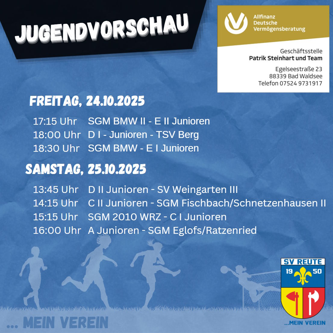 Freitagabend geht’s für beide E-Junioren nach Staig zur SGM Blitzenreute/Mochenwangen/Wolpertswende. Wichtige Punkte möchten die D1-Junioren ebenfalls am Freitag in der Leistungsstaffel zuhause gegen den TSV Berg holen. Am Samstag stehen drei Heimspiele auf dem Programm. Die D2-Junioren erwarten den SV Weingarten II, die C2-Junioren treffen auf den Tabellenführer SGM Fischbach/Schnetzenhausen II. Die A-Junioren treffen auf den Tabellendritten SGM Eglofs/Ratzenried. Zum Spitzenspiel nach Wilhelmsdorf fahren die C1-Junioren, Tabellenführer FG 2010 WRZ ist mit fünf Siegen noch ohne Punktverlust an der Spitze.