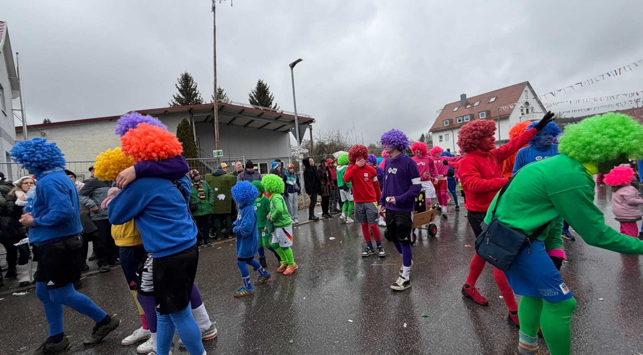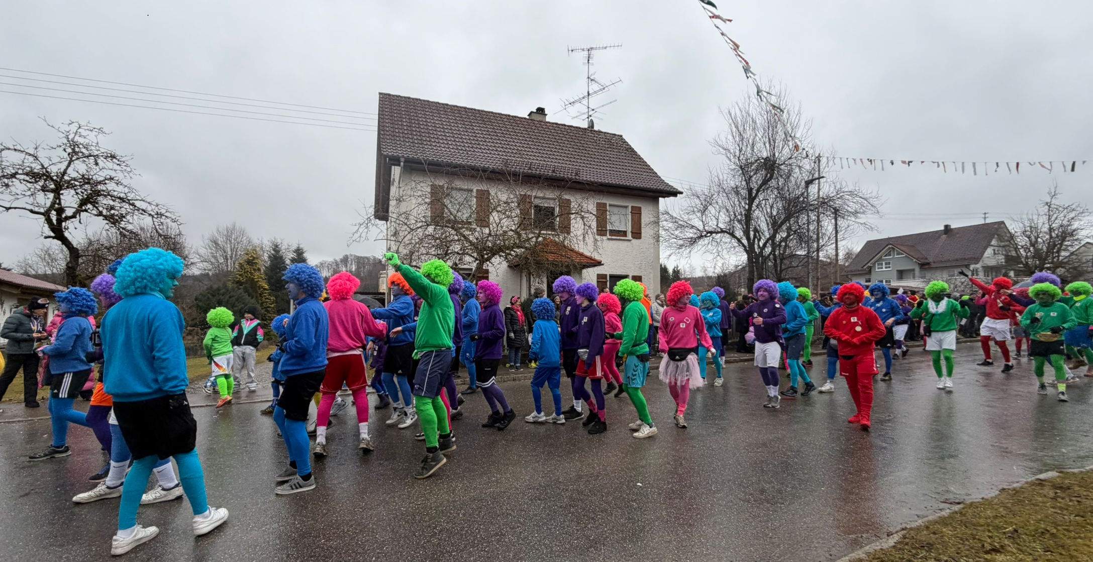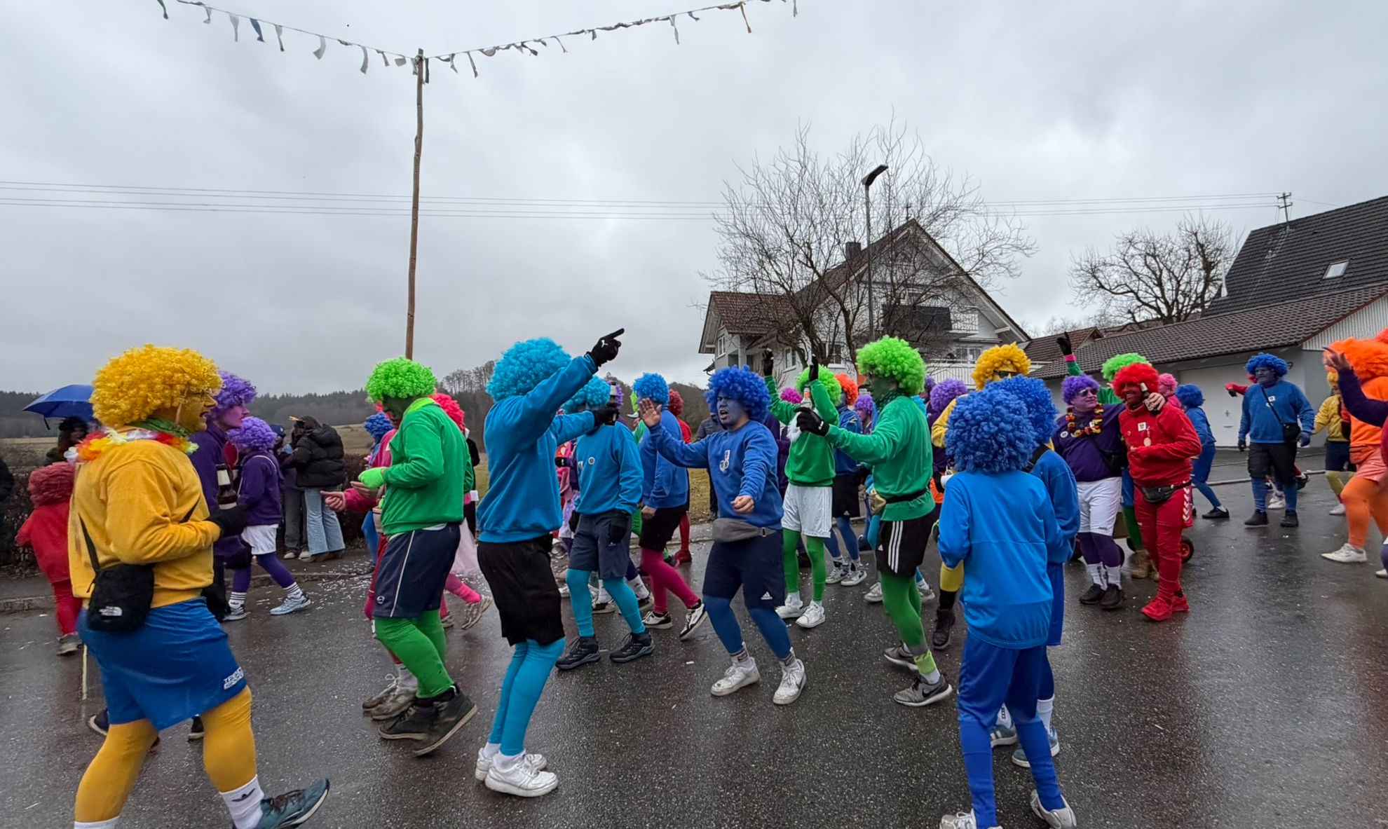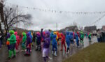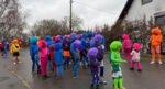 Die SVR-Fasnetsgruppe war am gestringen Sonntag wieder traditionell beim Fasnetsumzug im Mittelurbacher Königstal zu Gast und mit einer über 60-köpfigen Kunterbunt-Gruppe am Start. Das Wetterglück war dieses Mal dem närrischen Treiben in Mittelurbach nicht hold, den widrigen äußeren Bedingungen zum Trotz fanden sich wieder zahlreiche Zuschauer zum beliebten Umzug ein. Treffpunkt und Einstimmung war bereits vormittags in der SVR-Sportgaststätte bei einem Weißwurstfrühstück, für die Anfahrt nach Mittelurbach sorgte wieder ein Sonderbus von SVR-Werbepartner Omnibus Müller.