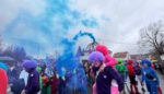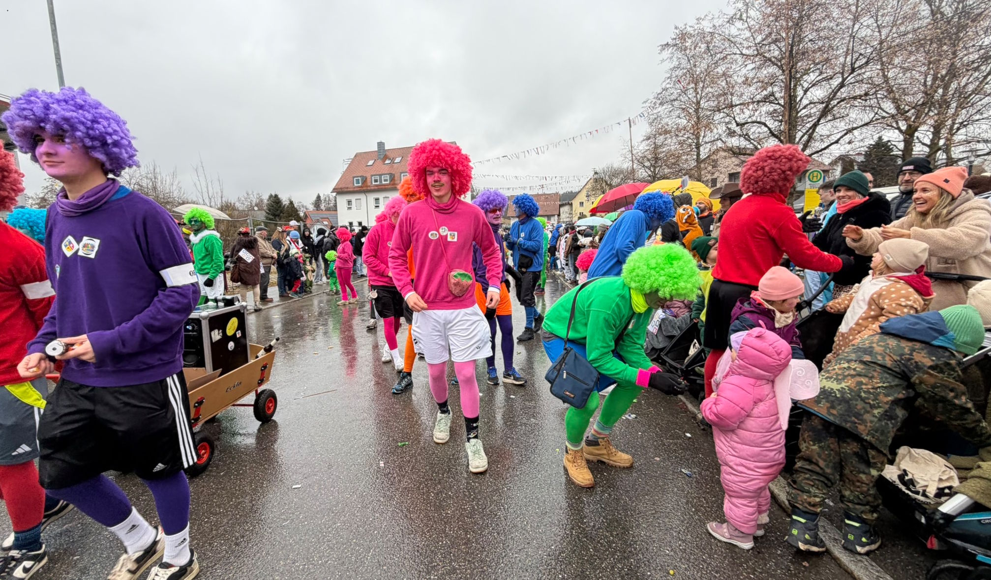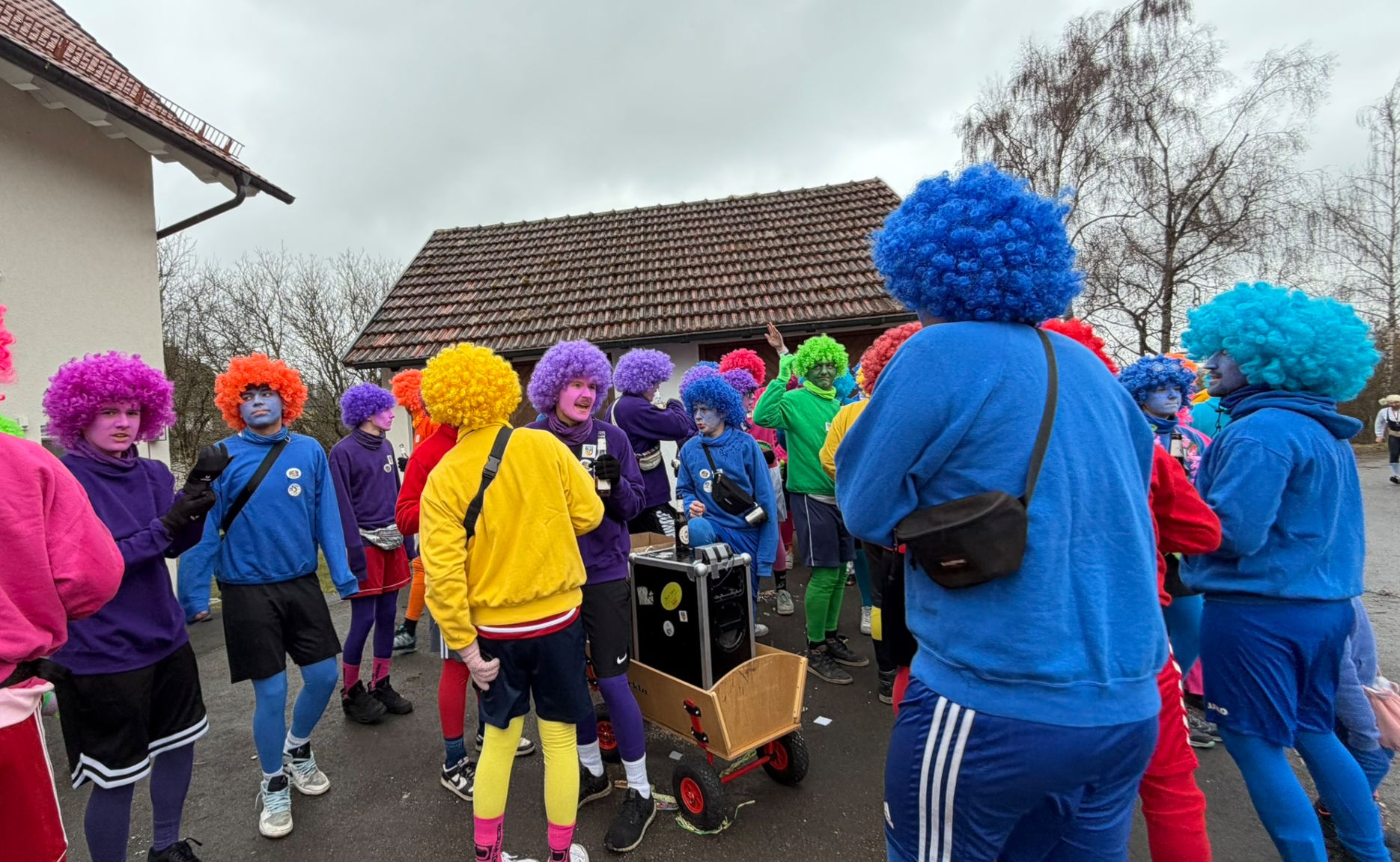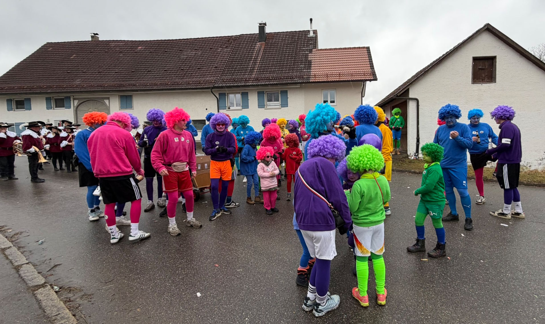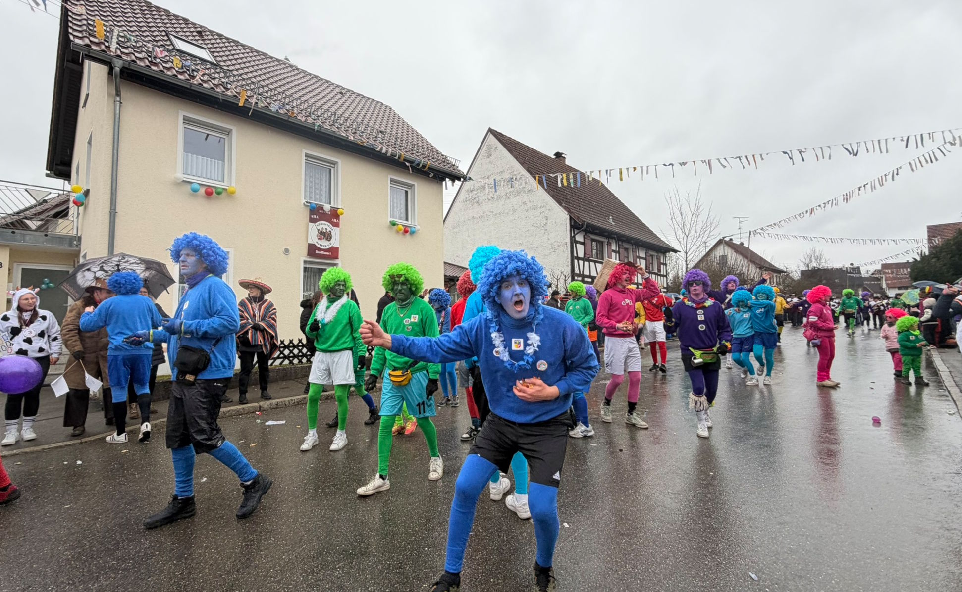Die SVR-Fasnetsgruppe war am gestringen Sonntag wieder traditionell beim Fasnetsumzug im Mittelurbacher Königstal zu Gast und mit einer über 60-köpfigen Kunterbunt-Gruppe am Start. Das Wetterglück war dieses Mal dem närrischen Treiben in Mittelurbach nicht hold, den widrigen äußeren Bedingungen zum Trotz fanden sich wieder zahlreiche Zuschauer zum beliebten Umzug ein. Treffpunkt und Einstimmung war bereits vormittags in der SVR-Sportgaststätte bei einem Weißwurstfrühstück, für die Anfahrt nach Mittelurbach sorgte wieder ein Sonderbus von SVR-Werbepartner Omnibus Müller.