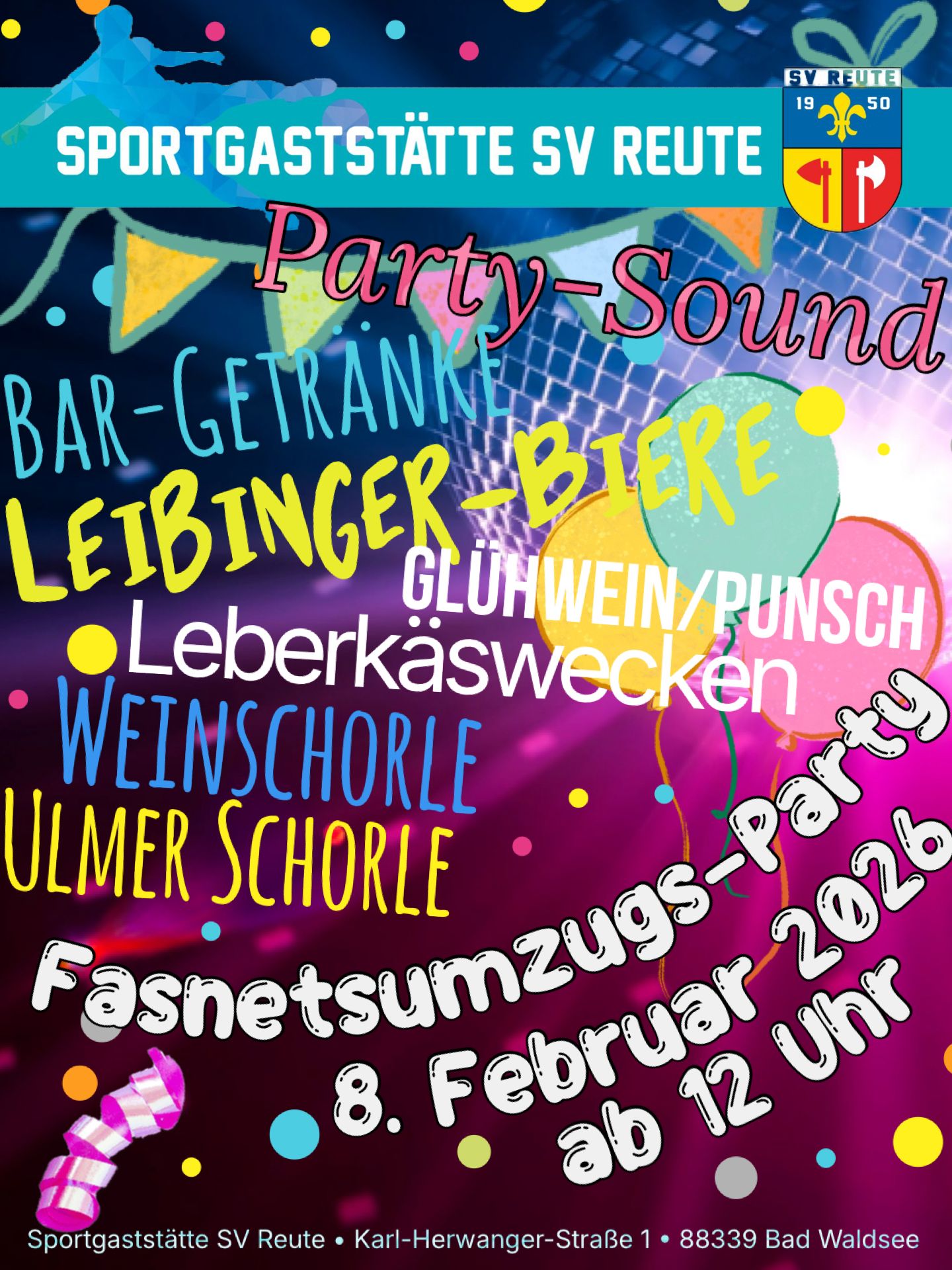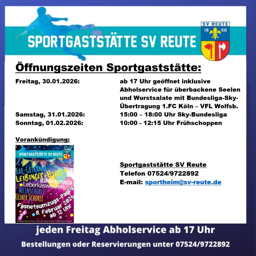 Die Sportgaststätte SV Reute hat diese Woche (30. – 01.02.2026) am Freitagabend ab 17 Uhr inklusive dem Abholservice für überbackene Seelen und Wurstsalate geöffnet, Samstagnachmittag zur Sky-Bundesliga und Sonntagvormittag zum traditionellen Frühschoppen geöffnet. Weitere Infos unter 07524/9722892.